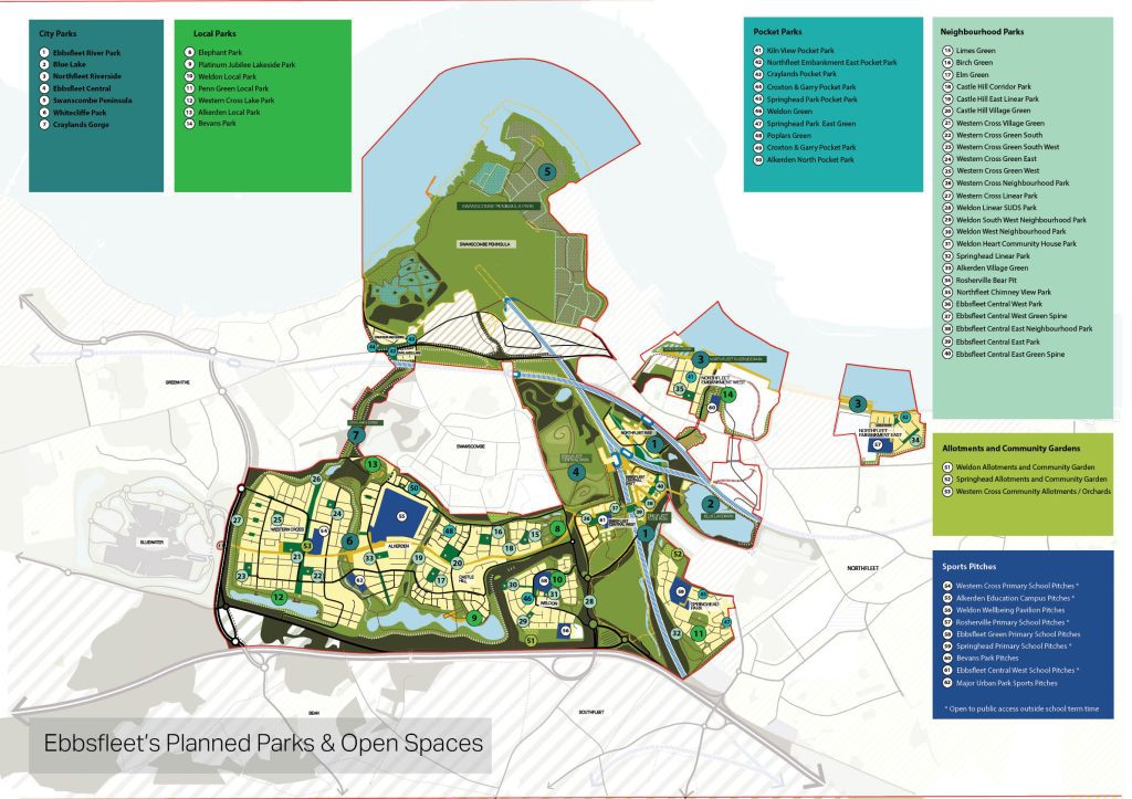 More than 50 new parks and open spaces are planned for Ebbsfleet, with 7 city new parks and over 40% of the Ebbsfleet regeneration area dedicated to blue and green space, the equivalent of over 1000 football pitches, or 42 Bluewater Shopping Centres!